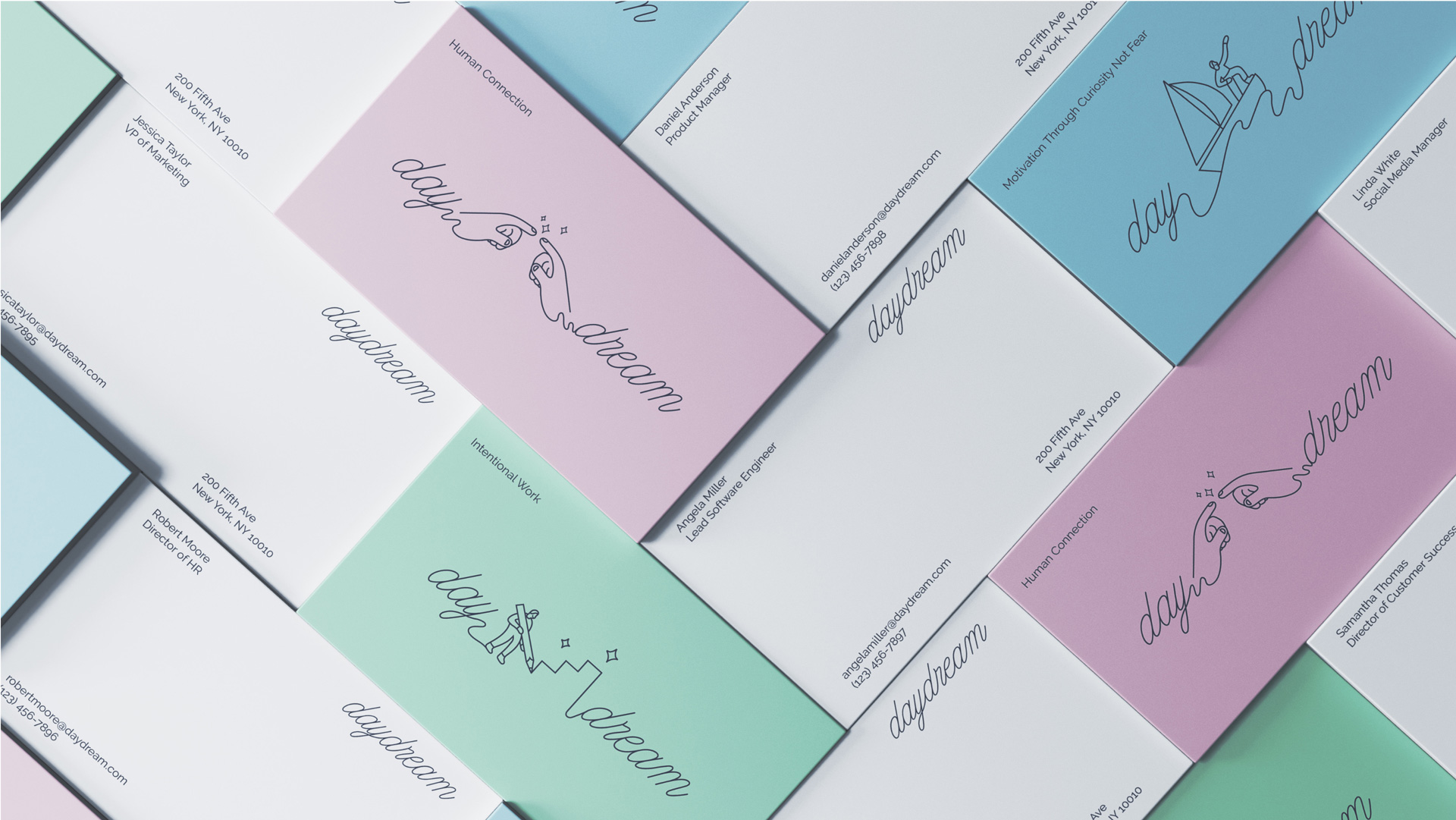 We created a custom logotype inspired by flow and connection, forming a whimsical design system that mirrors the essence of a daydream—where time stretches and feels suspended. The resulting whimsical and flexible identity system evolves with Daydream, as they expand on their capabilities and technologies.